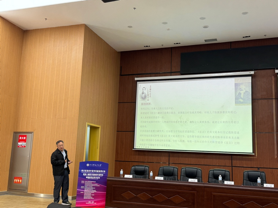 论坛开幕式由四川轻化工大学外语学院云虹院长主持,四川轻化工大学副校长胡光忠教授、四川省应用外语研究会会长李伟彬教授分别致辞,强调当前外语学科需主动融入国家发展战略,推动高水平对外传播与高素质人才培养。多位专家围绕外语教育未来发展作主旨发言,如:上海外国语大学韩子满教授探讨智库翻译话语构建,强调国际传播能力的战略价值;电子科技大学胡杰辉教授深度解析生成式AI背景下外语学科的结构调整与拔尖人才培养。这些主题不仅回应了新技术对外语教育的挑战,也为吉利学院外国语言与文化学院本科教学评估背景下推进“以赛促学、以用促教、以研促改”的教学改革与本科学科建设提供了新思路。孔令翠教授受邀作主旨报告,题为“误传与真实:陈望道译〈共产党宣言〉过程中的若干关键细节考证”。报告以严谨的历史考据方法,梳理国内相关研究的不同观点,围绕英文底本来源、文本校对等方面展开深入探讨,结合大量第一手档案资料,提出了更具逻辑一致性和历史真实性的研究结论。该报告得到与会专家的高度认可,受到听众的欢迎。对翻译研究具有积极示范意义。