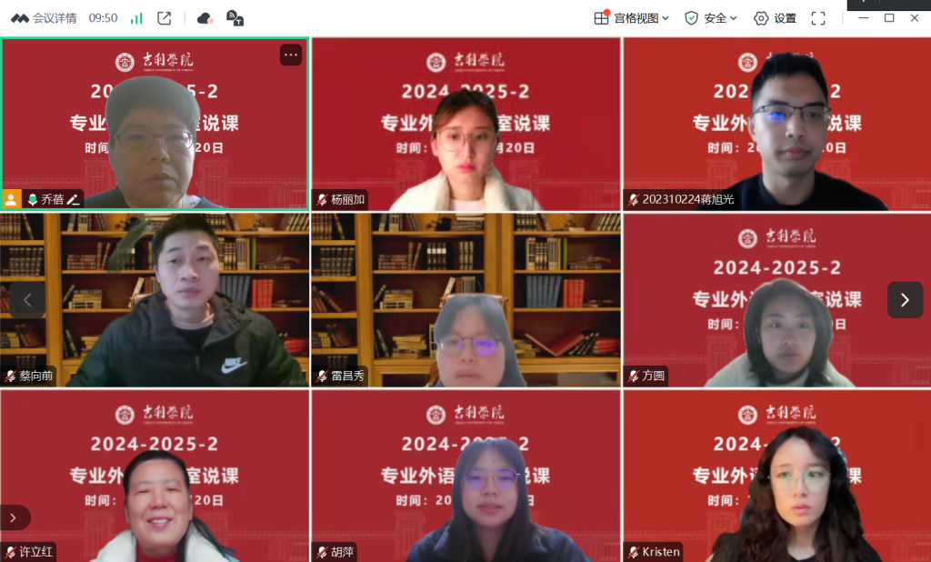 2024年2月20日上午,专业外语教研室成功举办了2024-2025-2学期开学前的说课活动,共有38位老师分两组同时在线参加,教研室负责人乔蓓老师和赵莉老师分别主持了活动并给与点评。本次活动旨在为新学期的教学工作做好充分准备,确保教学质量和教学效果的提升。全体教师积极参与,展示了各自课程的设计思路和教学亮点,活动取得了圆满成功。