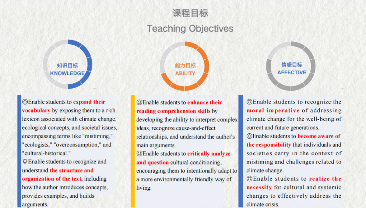 冯月老师在《高级英语(2)》课程中,结合环境保护、代际理解等主题,引导学生思考社会责任和文化传承,增强了学生的文化自信和全球责任感。卢开砚老师则在《高级英语(2)》课程中,通过对比中外文化,特别是中国传统文化与西方文化的异同,增强了学生的文化认同感和跨文化交际能力。