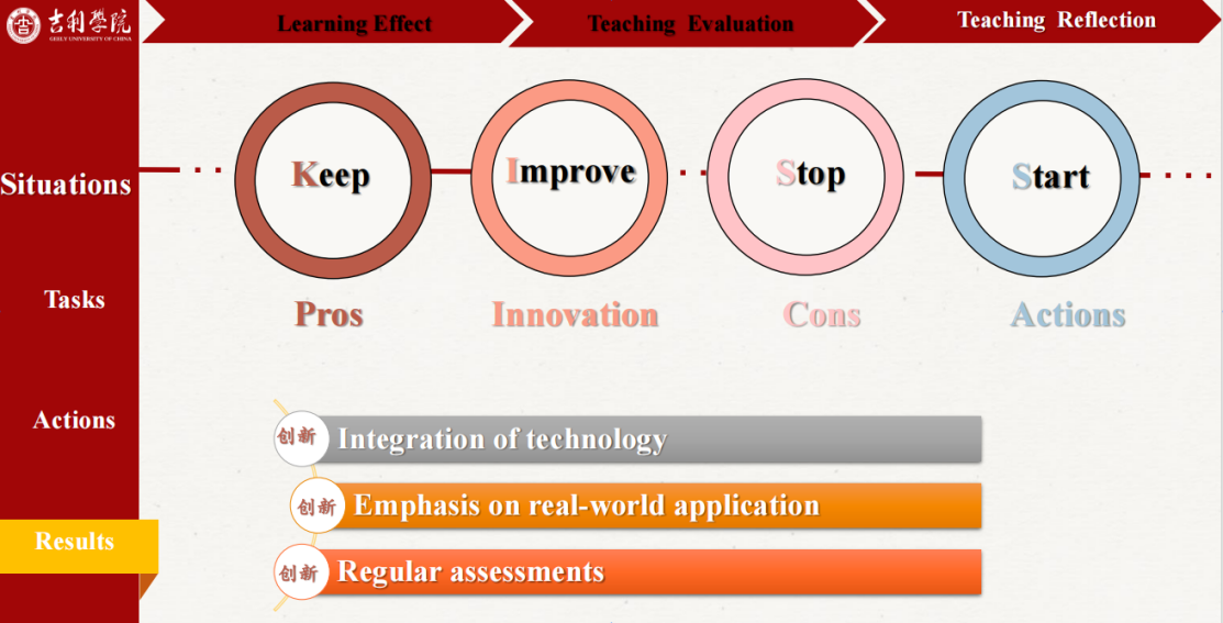 本次说课活动中,多位老师强调了“以学生为中心”的教学理念,注重学生的参与度和自主学习能力的培养。例如:杨丽加老师在《大学英语(2)》课程中,设计了丰富的课堂活动,如角色扮演和辩论,激发了学生的学习兴趣和参与度。林秋月老师在《大学英语(2)》ESP课程中,通过小组讨论和任务驱动的方式,培养艺体班学生的合作精神和批判性思维能力。年轻教师的成长也非常迅速。代霜老师在《汽车英语》课程中,采用了情境教学法和任务教学法,模拟汽车展厅环境,帮助学生更好地理解和应用专业英语。