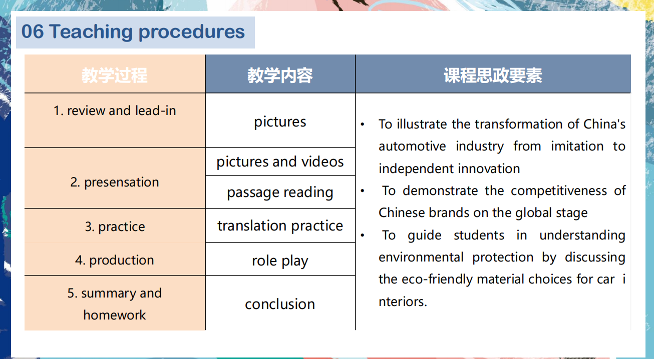 本次说课活动中,多位老师展示了课程团队的协作精神,分享了教学资源和经验。例如:蔡向前老师在《汽车商务英语》课程中,结合了两本教材的优势,设计了互补的教学内容,体现了团队合作的精神。冯月老师在《高级英语(2)》课程中,分享了课程团队的教学资源和经验,确保了课程的高质量实施。卢开砚老师在《高级英语(2)》课程中,强调了课程团队的协作,特别是新成员的加入,进一步提升了课程的建设水平。