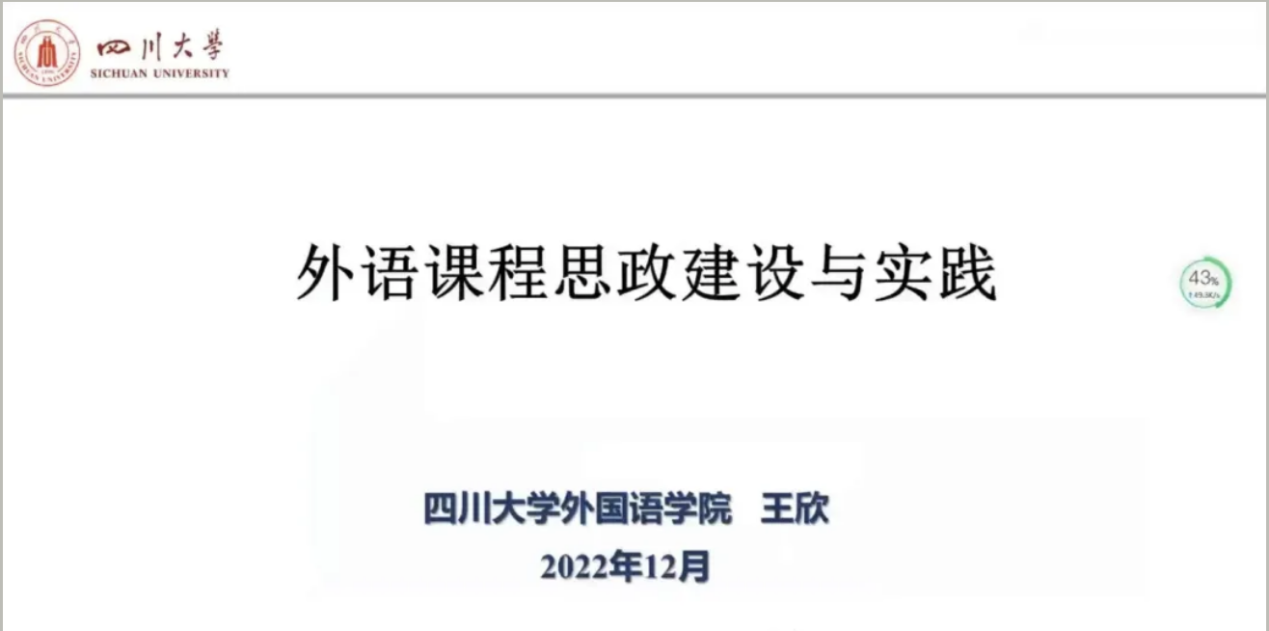 2022年12月14日,由外国语言与文化学院举办的“课程思政”建设专题活动开讲。此次活动特邀教育部英语专业教学指导委委员、四川省学术和技术带头人、四川省外语专委会会长、四川省本科教学评估评审专家、四川大学国家一流专业建设点英语专业负责人王欣教授担任主讲嘉宾。