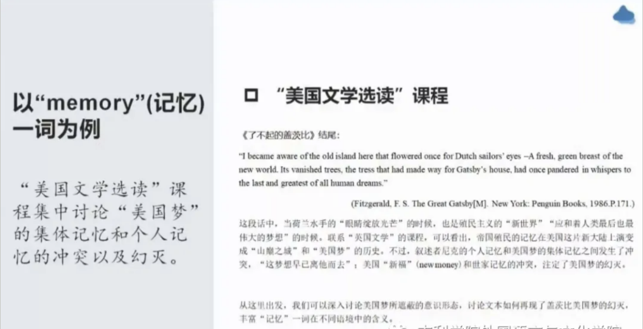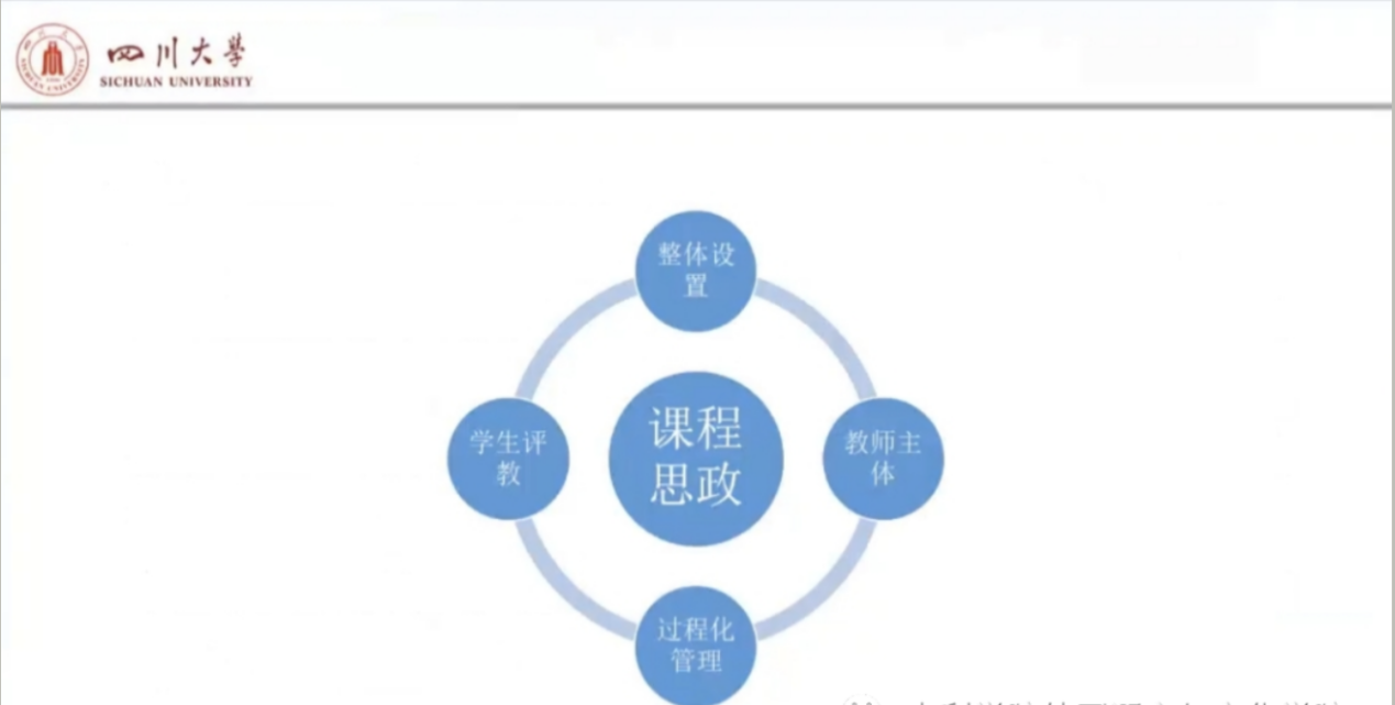 王教授指出,在课程思政建设的三个维度中,角度是要站稳中国视角,实现价值引领,以达到讲好中国故事的目的;深度则是要打造学习共同体,引导价值判断,即在英语语言文学的堂堂教学中,教师时刻要关注的是价值观念是语言学习的核心,思维培养是语言教学的重点;温度是要把握情感认可,实现价值认同,因为情感对于认知是必要条件,并且和美学经验、道德感相联系的。自我塑造有利于情感认同的人格特征是实现积极有效价值引领的首要条件。王教授以四川大学英语课程群建设实际案例给教师们分享经验。以“memory”一词为例,从综合英语、文学批评与实践、文学专题研究、英国文学选读等课程分析如何打造课堂学习共同体,培养学生问题意识,引导学生家国情怀的情感认同。王教授指出可以通过教学资源和教师互评、加强过程化教学管理、加强学生主观评价等方式克服建立课程评价体系的难点。