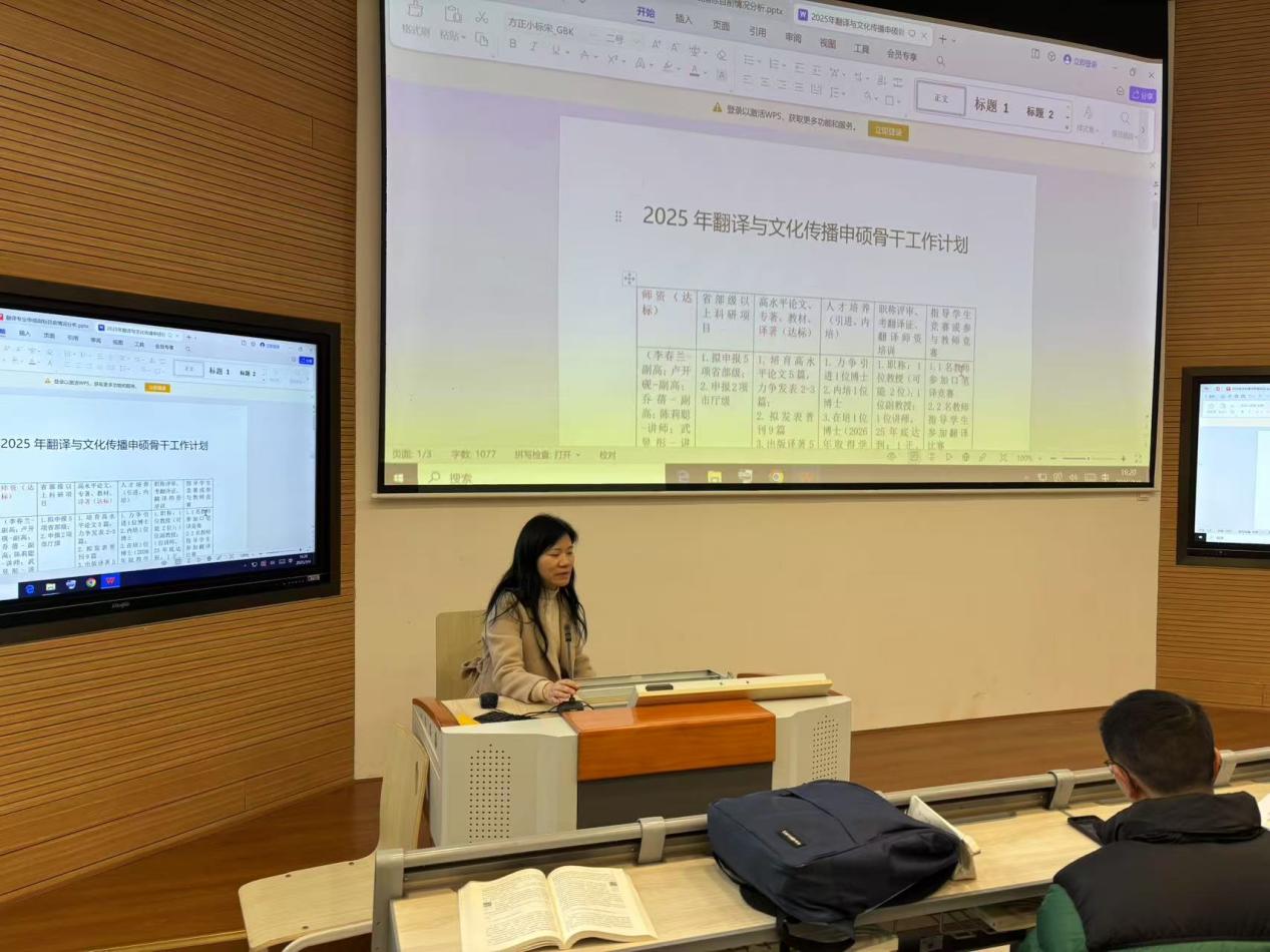 学院科研与申硕中心主任武昱彤对外国语言与文化学院翻译专业申硕指标的现状进行了深入分析,根据当前数据与目标之间的差距,指出具体的攻坚目标。汽车文化翻译与传播团队的负责人李春兰副院长和是汽车科技与商务翻译团队负责人谢锦教授团队王倩博士分别对本团队申硕计划,具体到逐年实现的目标进行了拆解。学院申硕工作指导专家金黛莱教授对翻译学科建设特色进行了分析,指出:为了辅助申硕,本科课程基础要打牢与优化。