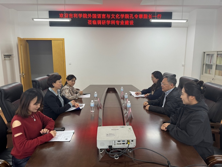 2025年4月26日,吉利学院外国语言与文化学院院长孔令翠一行六人赴四川轻化工大学宜宾临港校区,与四川轻化工大学外语学院院长云虹教授、副院长吴春容教授、学院骨干教师等就学科建设、硕士联合培养、合格评估等问题展开调研,并就如何进一步协同推进外语学科的发展和本科评估工作进行了深入交流。