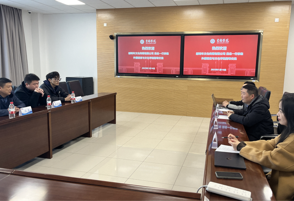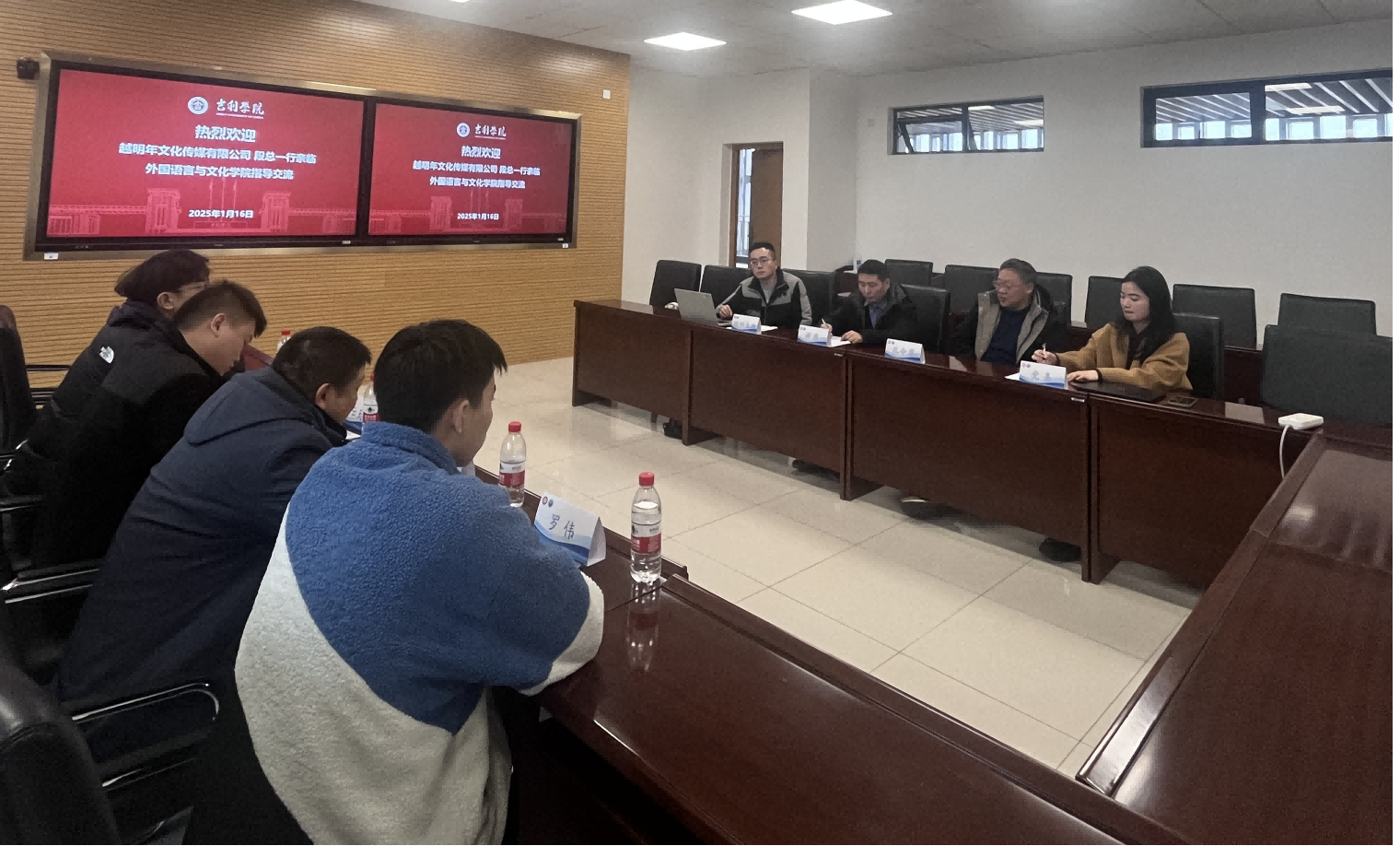 2025年1月16日,越明年文化传媒有限公司总经理段勇一行莅临外国语言与文化学院,与学院领导及教师团队进行了深入交流与指导。此次访问旨在深化校企合作机制,推动产教融合与人才培养模式的创新发展,为广大学子的职业生涯开辟更多元的发展路径。