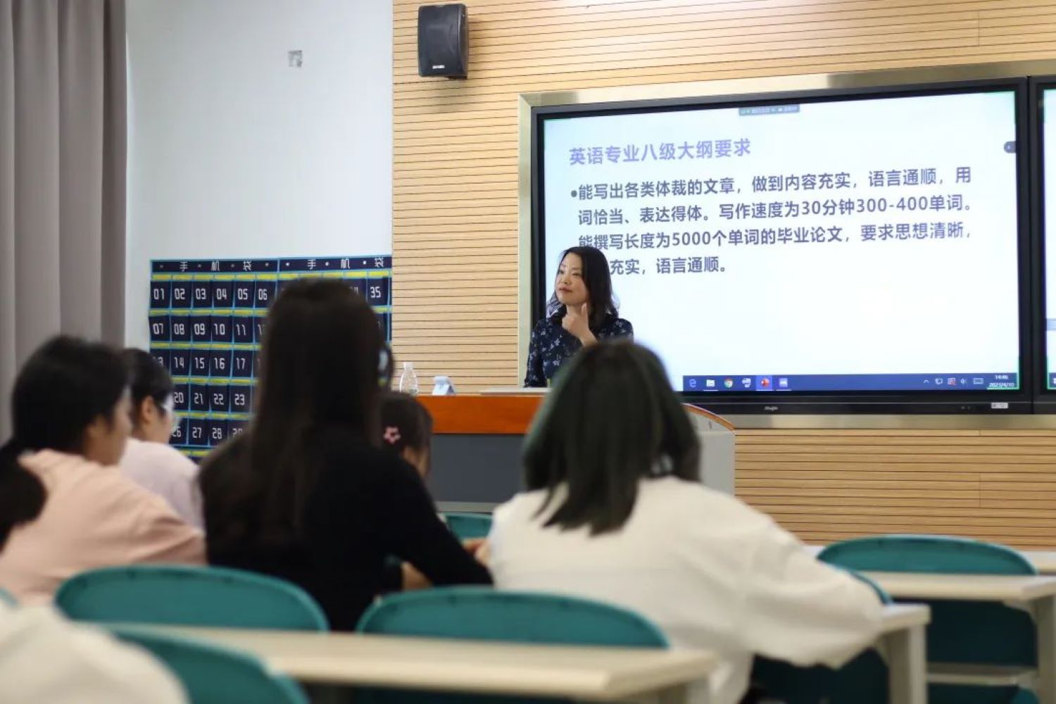 为了提高英语专业学生的学习能力,培养学生对专八的考试逻辑思维,2023年4月10日,外国语言与文化学院开展了英语专业专八写作、翻译考试技巧专题学术讲座。此次讲座特邀请四川师范大学外国语学院雷冬梅副教授、祖云鹏副教授为我院学生进行专八学术指导交流。