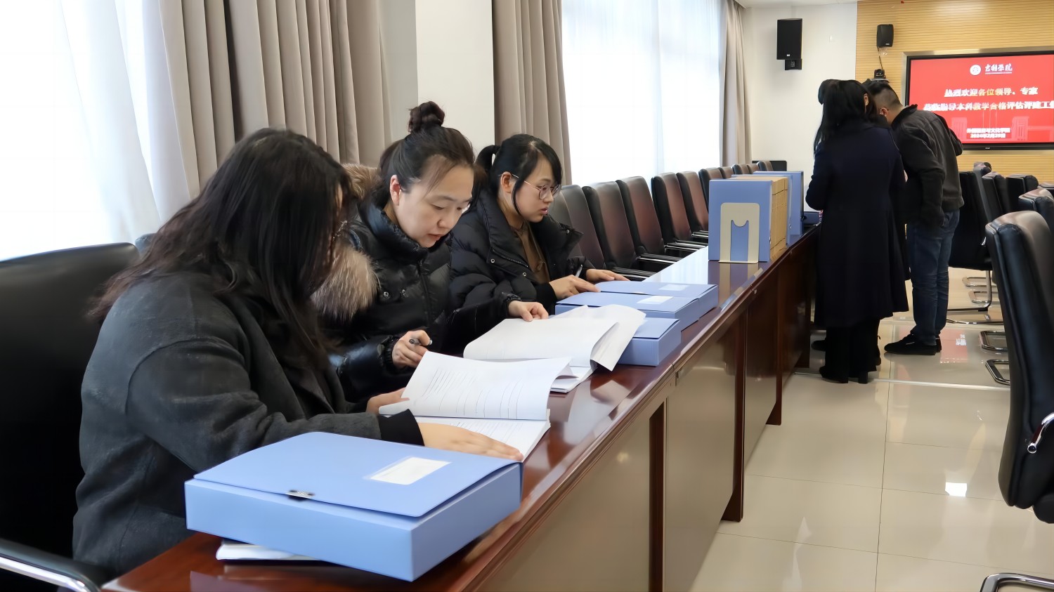 为应对此次重要的模拟评估检查,学院成立了模拟评估小组,专门组织和协调评估准备工作。来自专业外语教研室和大学外语教研室的老师们按照评估要求,精心完善了教学大纲、教案等资料,从科研、实习、教学等方面全面梳理了教研室建设工作特色,并汇总了教师说课、磨课工作开展情况,详细展示了教研室在学科建设、师资队伍培养等方面的工作。老师们根据评估项目整理了全面且详实的电子版材料,供专家仔细查阅。同时,为便于专家查看,老师们还挑选了代表性文件进行打印和归档装盒,确保井然有序地开展检查工作。