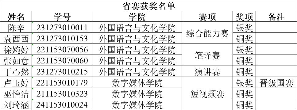 我校高度重视此项赛事,自2021年起已连续五年组织学生参赛。2025年3月,外国语言与文化学院正式成立竞赛中心,系统性地开展选手选拔与培训工作。在校赛阶段,全省共有2.5万余名学生参与;经严格选拔,我校共派出14名个人选手与3支团队晋级省赛,参与了综合能力、演讲、笔译、口译、日语及短视频等多个赛项的激烈角逐,最终取得历史性佳绩(获奖名单如下)。