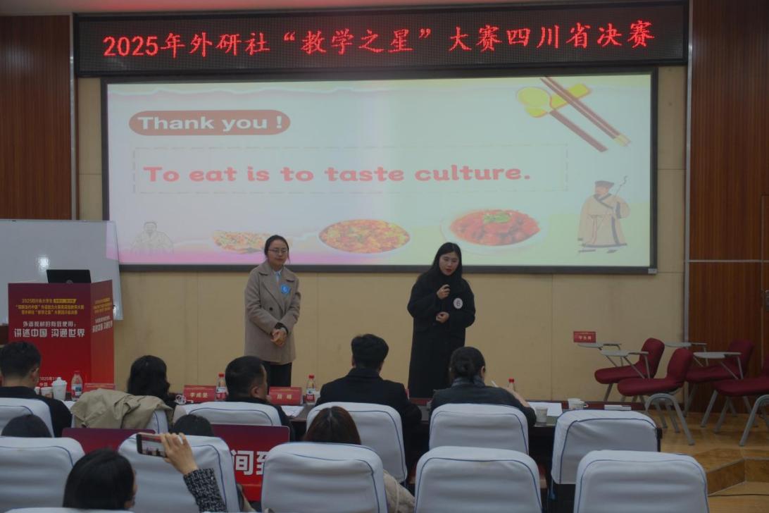 作为全国高校外语教育领域的标杆性赛事,四川省“教学之星”省赛以专业水准、规范流程和科学评价体系著称,是检验高校教师教学水平的重要标尺。在比赛现场,团队分工明确、配合默契,展现了卓越的综合素养:于姝婷老师精准把控说课环节,条理清晰地展现了课程的整体架构与特色亮点;杨丽萍老师的10分钟现场教学展示以生动的教学互动、娴熟的课堂驾驭能力和富有感染力的表达,将教学设计的创新理念转化为直观的教学效果。黄列梅、王倩、张俊三位老师则在前期备赛过程中全力以赴,深度参与课程方案研讨、教学细节打磨和模拟演练优化,为团队的最终获奖奠定了坚实基础。