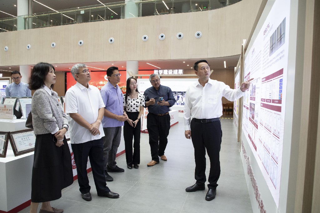 首先,外宾先参观的是吉利学院的图书馆,在王弋老师全程英语文的讲解下,外宾们从学校发展历史、人才培养、产教融合、学科与科研、建设成果、三创教育理念、三创孵化赋能和构建“大思政”这八个主要方面解到了吉利学院的历史沿革与当前的发展以及学校创新创业教育、实践教学、科技成果转化、教育教学等方面的办学成果及人才培养特色。