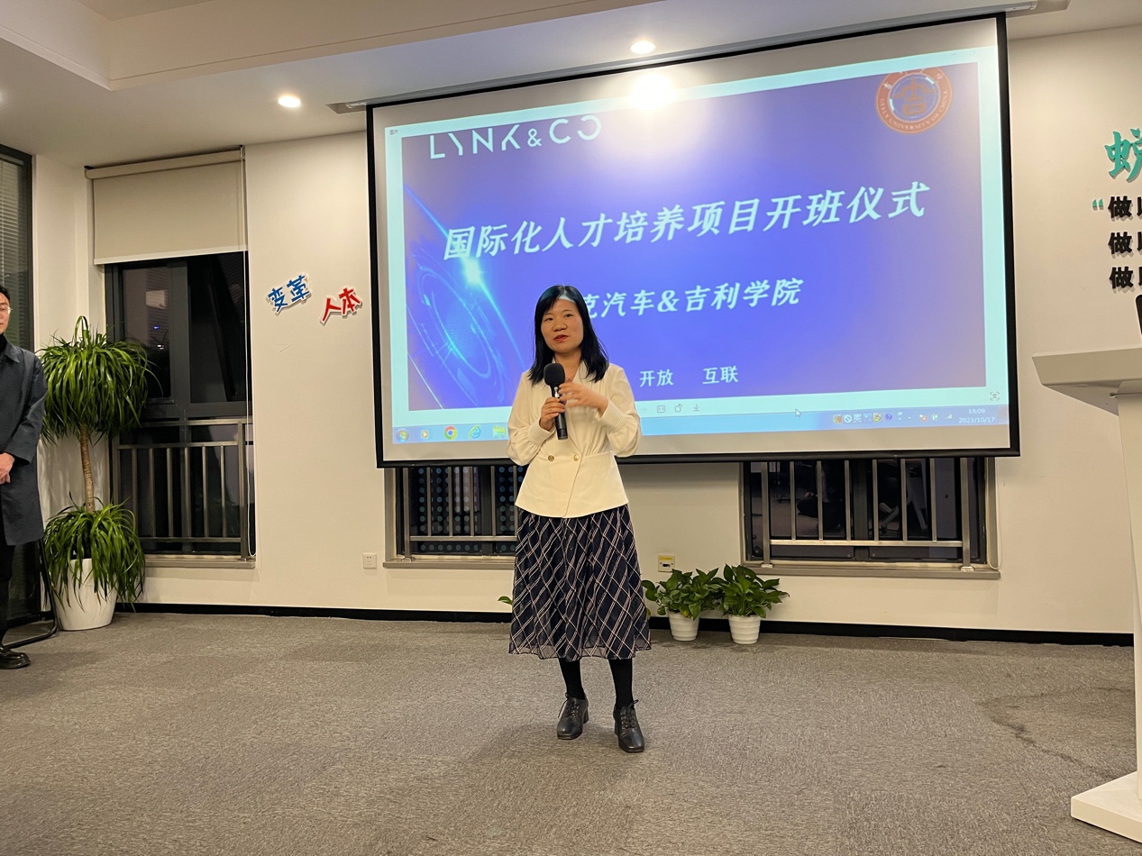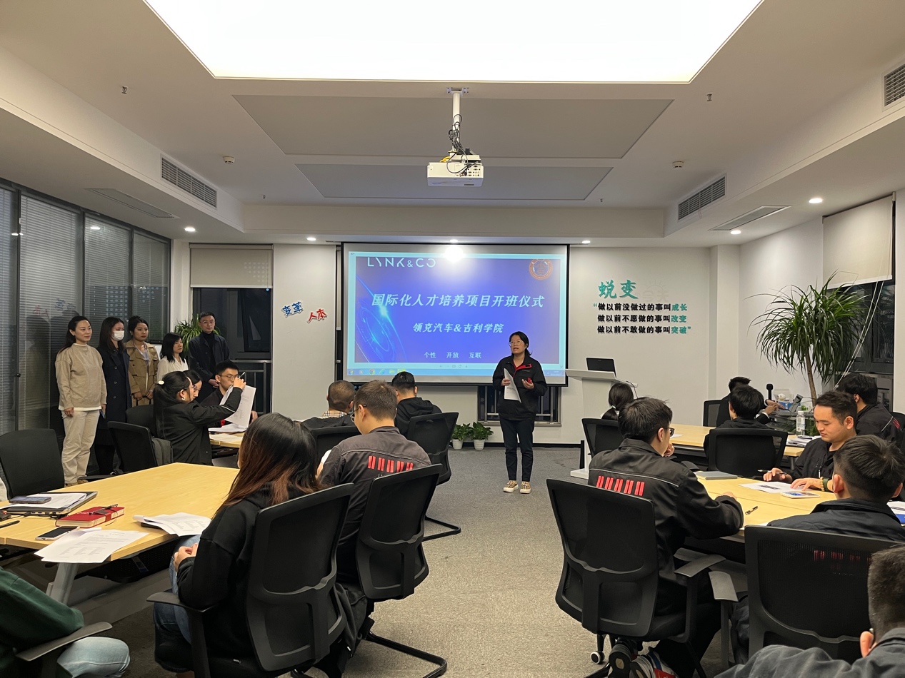 在开班仪式上,领克汽车技术部经理胡强、人力资源培训主管姚卫及学员代表分别发言,强调在全球化背景下语言能力与专业技能融合提升的重要性。吉利学院外国语言与文化学院院长助理李春兰介绍了课程结构与考核方式,并寄语学员“学以致用、开拓国际视野”。随后,学院教师带来生动的“国际商务英语第一课”,课堂互动积极,反响热烈。