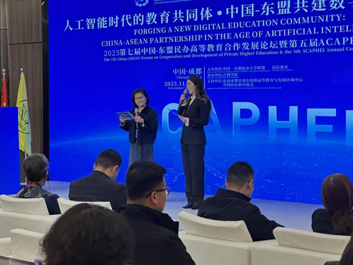 2025年11月25日至26日,第七届中国—东盟民办高等教育合作发展论坛暨第五届ACAPHEI年会在我校成功举办。本届论坛以“人工智能时代的教育共同体:中国—东盟共建数字教育新生态”为主题,吸引20余所亚太地区高校、百余名教育管理者与专家学者共话数字教育未来。外国语言与文化学院组建的语言服务团队,以高质量的语言能力、过硬的专业素养和系统化的团队协作圆满完成了各项翻译与保障任务,全程为论坛提供稳定、流畅、国际化的语言支持。