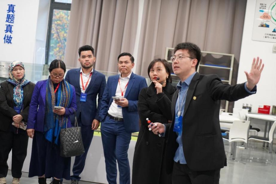 专项参观翻译聚焦专业领域,助力学校产教融合成果精准输出。团队成员分别驻守图书馆、三创中心、汽车实训楼等校园核心场所,为外宾提供细致解说。在翻译过程中,结合学校办学理念与产业实践背景进行通俗化表达,帮助外宾深入理解学校优势学科特色与产教融合成效,为后续校际合作搭建有效沟通桥梁。