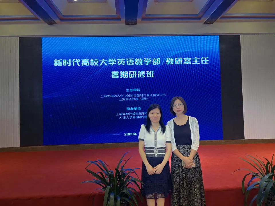 2023年7月15-18日,外国语言与文化学院院长助理李春兰、教研室副主任黄列梅参加了由上海外国语大学中国外语教材与教法研究中心、大理大学外国语学院、上海外语教育出版社和上海外教社教育培训中心联合举办的川渝湘桂滇五省高校大学英语教学部/教研室主任暑期研修班。本次研修班邀请了多位知名专家,共同探讨大学英语教学的新趋势和改革方向。