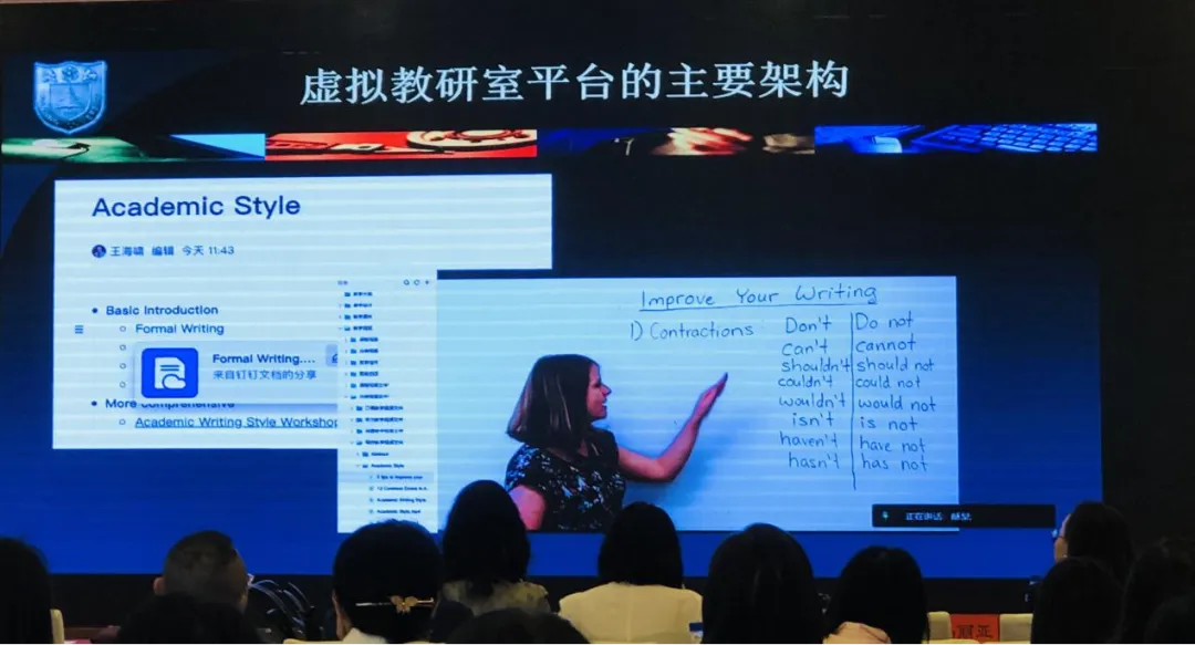 南京大学的王海啸教授首先发表了题为“基于虚拟教研室平台的大学英语教学改革新探索”的演讲。王教授详细介绍了虚拟教研室建设的背景与目标,以及其主要架构。