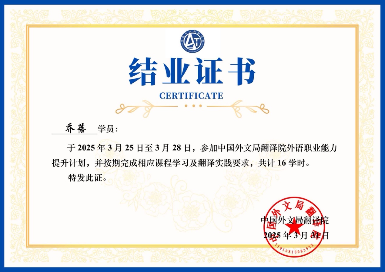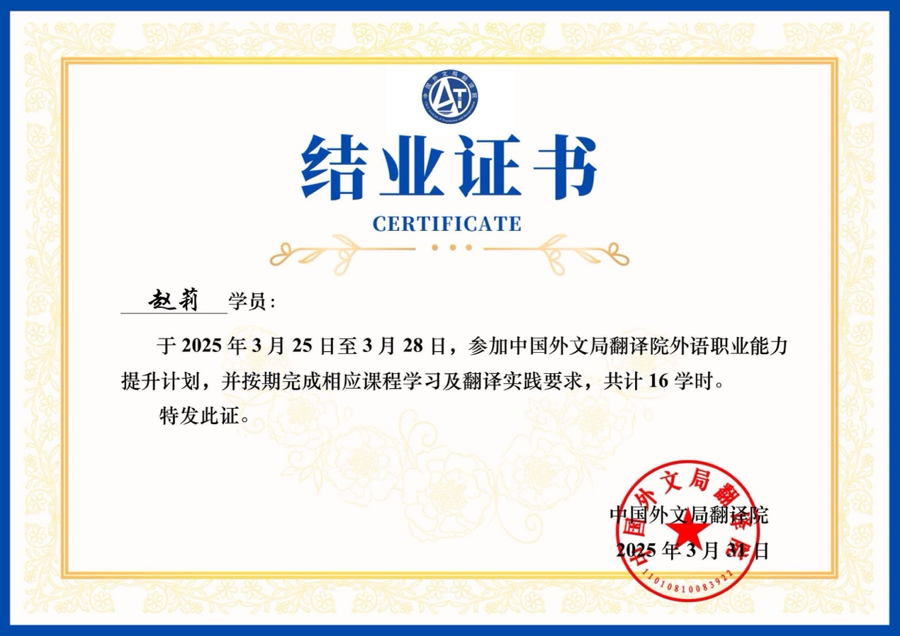 为深入贯彻学院“迎评促建、提质增效”的工作目标,持续提升教师专业能力和国际传播素养,2025年3月25日至28日,吉利学院外国语言与文化学院组织骨干教师参加了由中国外文局主办的第一期翻译能力提升计划线上培训。