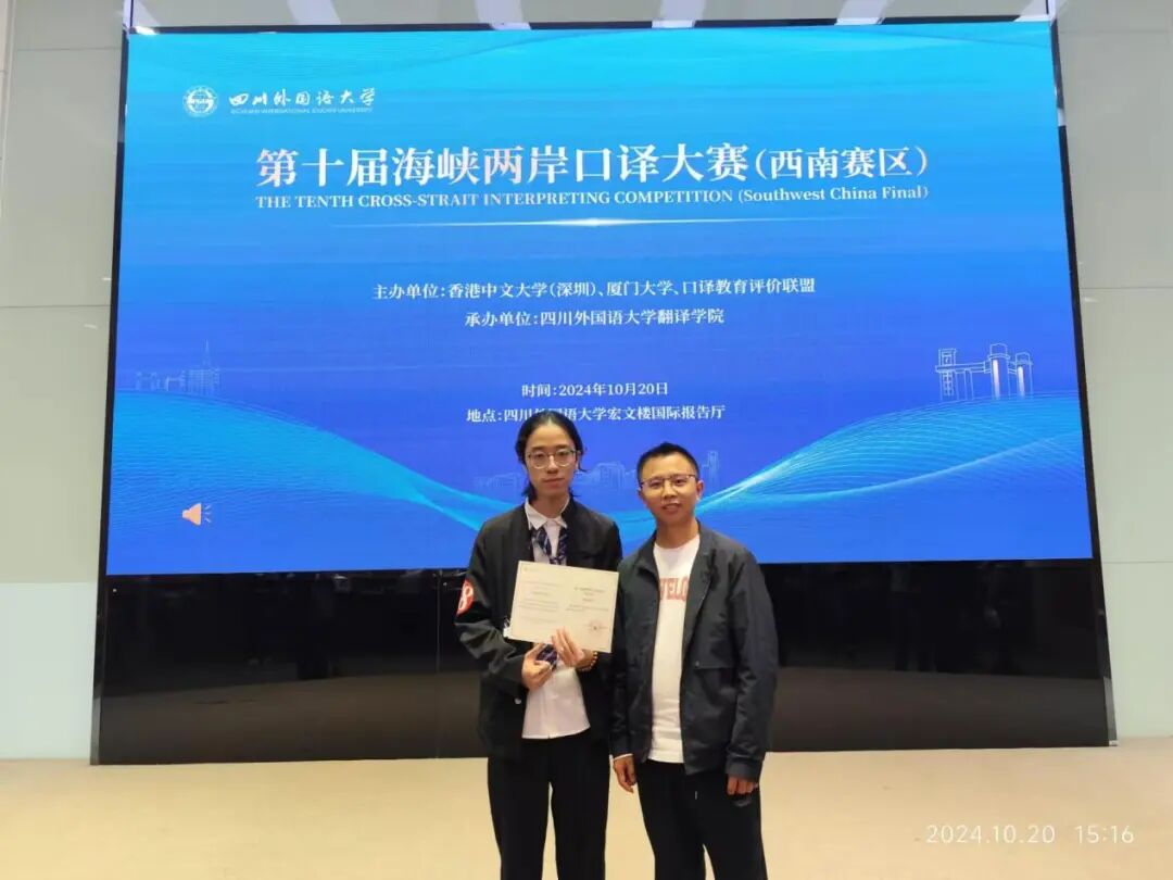 “第十届海峡两岸口译大赛”西南赛区比赛于2024年10月20日在四川外国语大学举行,我院江何安琪老师指导的学生张圣霖代表我校参赛,表现优异,获得“优秀奖”。这是我校首次派出学生参加这一比赛。